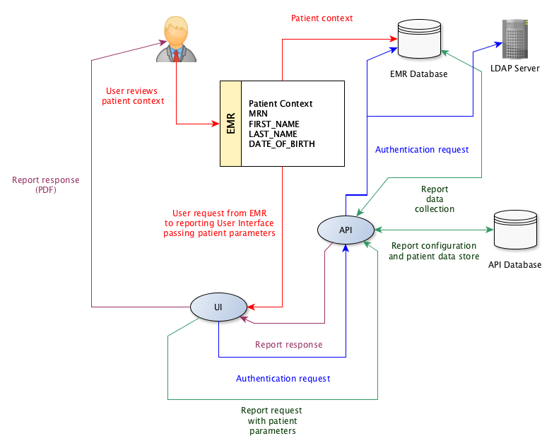 The user interface will request authentication (built in application or LDAP integrated) from the EMR user after which the report will be generated and displayed to the user.