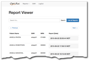 All report data is stored for later review. This also allows the EMR user to search for specific data on other patients previously accessed in OptiRec.